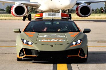 サンタアガタ・ボロネーゼの玄関口であるボローニャ空港には、ランボルギーニがフォローミーカーとして使われている。その7代目となる「ウラカンEVO」が登場した。