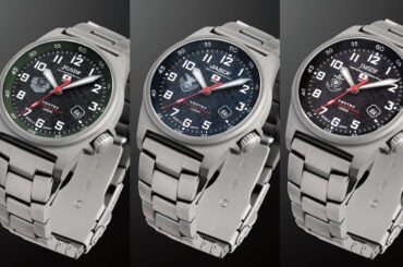 ダイヤルにはいずれも表面にエンボス加工が施されており、ワントーンでも光の差し込む角度によってさまざまな表情の変化が楽しめるようになっている。精悍なイメージの3連ブレスレットや視認性を高めた無反射サファイアガラス、10気圧防水など実用性の高い仕様も好印象だ。