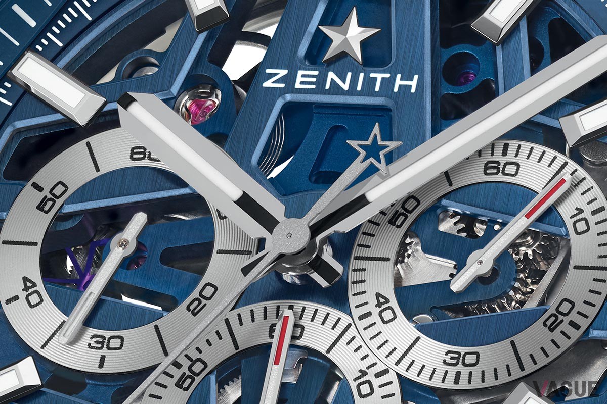 ダイヤルに施された特徴的なオープンワークは、3針モデルのスケルトンダイヤルと同じく、ゼニスの歴史的ロゴ「ダブルZ」を彷彿とさせるもの。サブダイヤルの内側に取り入れられた透かし彫りが立体感をいっそう強調します。