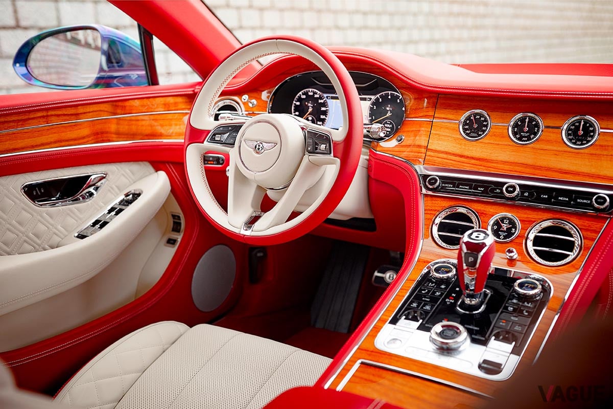 コンチネンタルGT V8クーペのボディカラーはライトサファイア。ディープブルーのヨットと並べると、すでに外観から共通したスタイルを感じ取ることができるが、圧巻は内装にある。