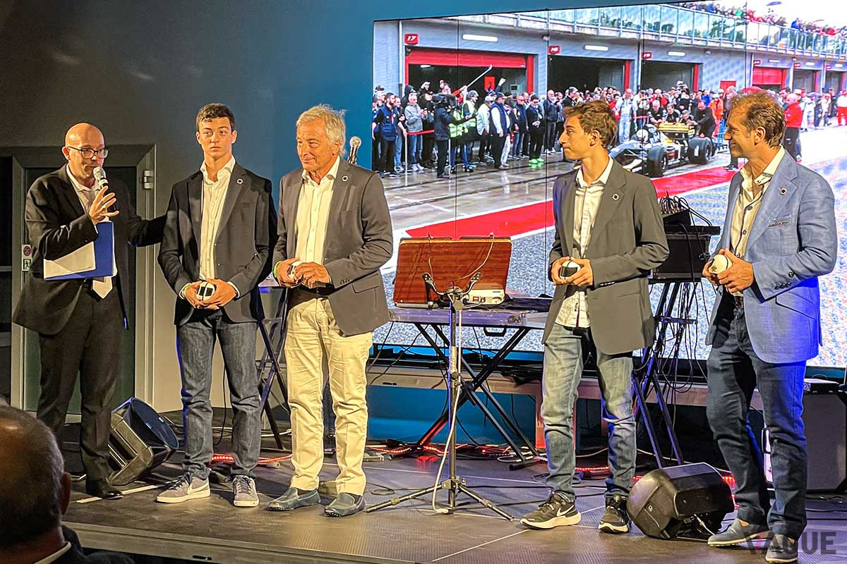 壇上には、ジャンカルロ・ミナルディを筆頭にアレッサンドロ・ナンニーニ、ピエル・ルイジ・マルティーニ、アレッサンドロ・カッフィ、ニコラ・ラリーニ、エマヌエレ・ピロ、ジャンニ・ジューディチ、最高年齢86歳のカルロ・ファチェッティ。そしてリッカルド・パトレーゼは現在F4で大活躍している15歳の息子ロレンツォと、ヤーノ・トゥルッリはF4、フォーミュラ ヨーロッパで大活躍をしている15歳の息子エンツォと共に壇上に上がった。