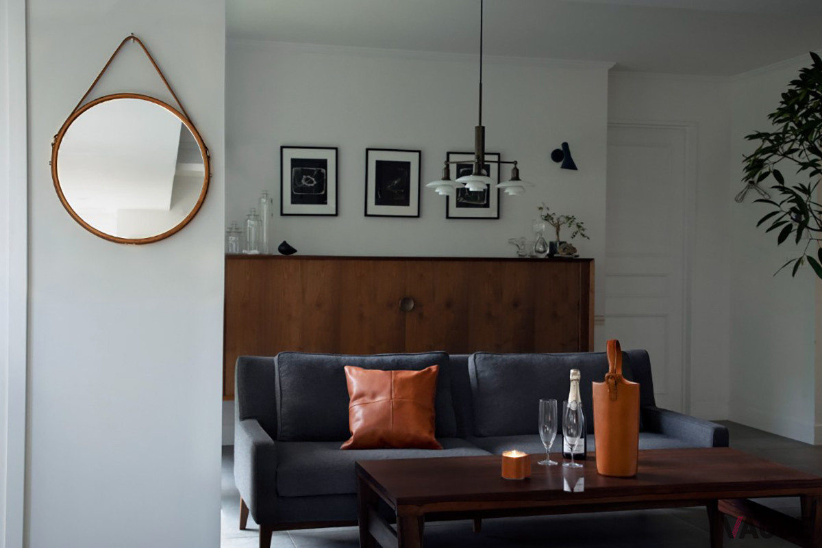木枠部分は、福井県鯖江市の人気木製雑貨ブランド・Hacoa(ハコア)の職人が手がけた特注品。円形にすることで窓のような開放感が生まれ、革のぬくもりと柔らかな印象が空間の雰囲気をアップグレードしてくれる。