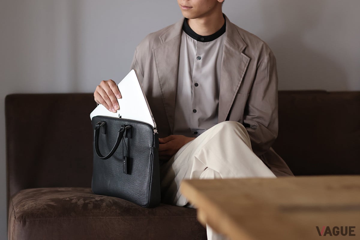 また、薄めのマチでスマートなシルエットに仕上げつつ、ノートパソコンやタブレット、A4サイズの書類といったビジネスに必要なアイテムはしっかり収納可能。年々少なくなりコンパクトになっている仕事道具を持ち運ぶのに最適な設計となっている。