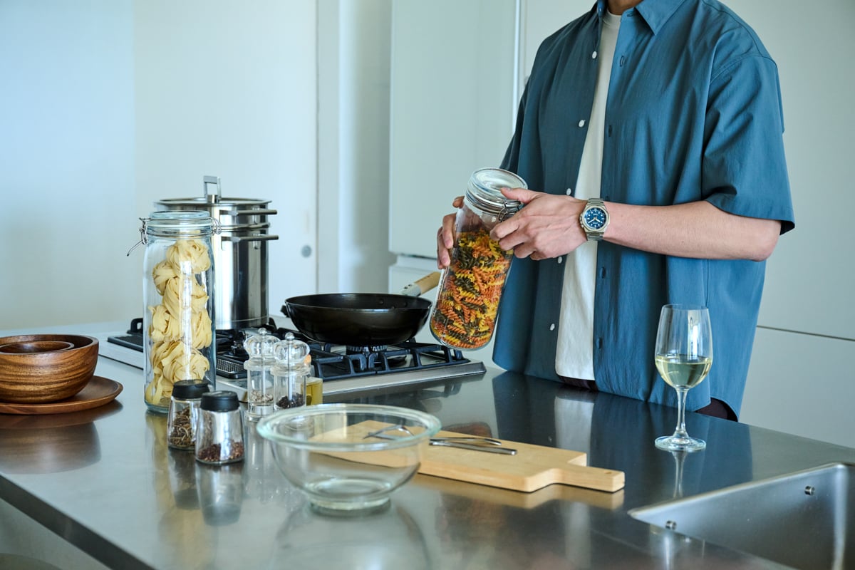 今どきはスマートフォンのタイマーアプリなどを使ったほうが便利なのかもしれませんが、アナログならではの機械式時計の楽しみ方として、パスタをゆでる時間などを計るのも小さな喜び。