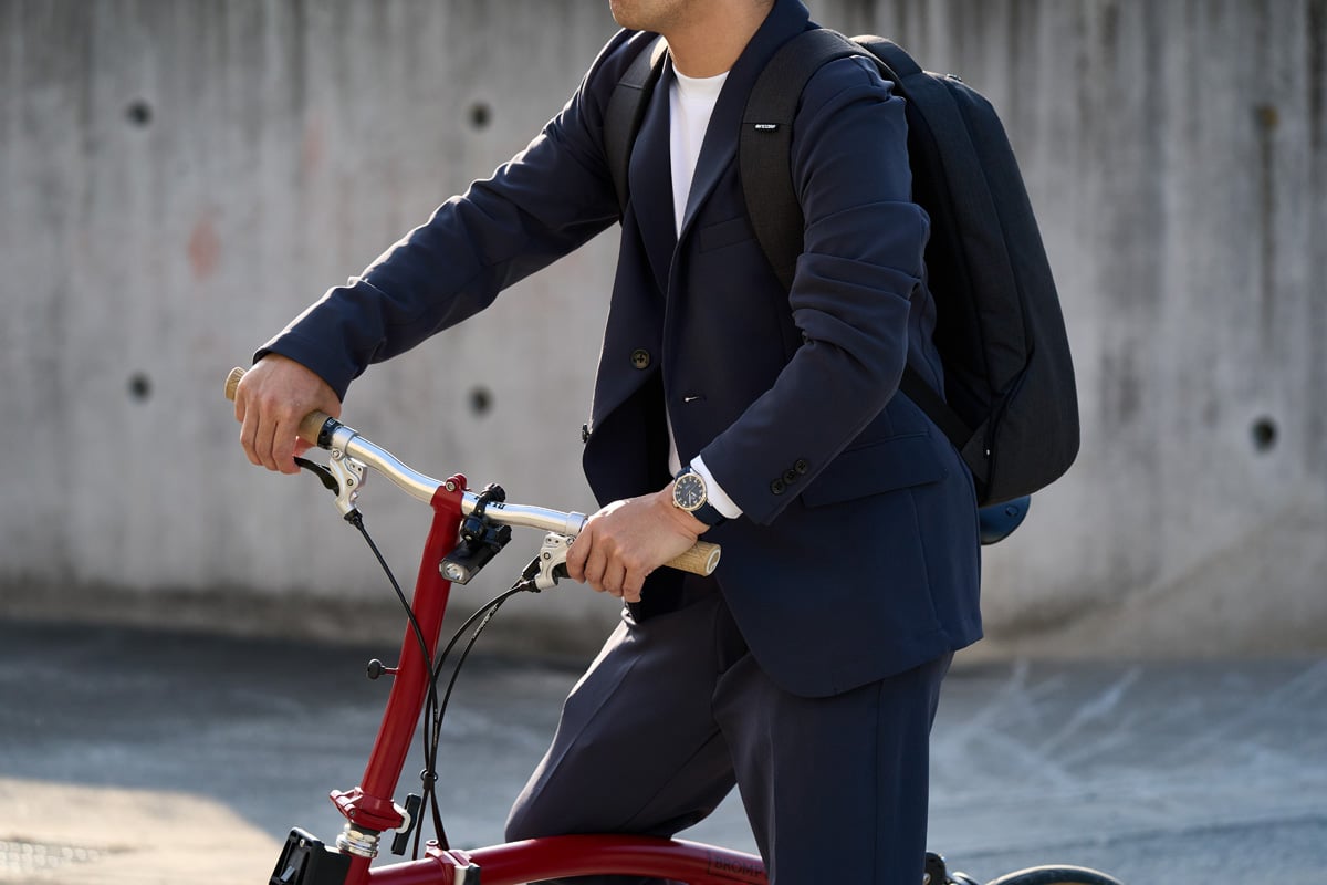 さらにカルレイモンの気配りを感じさせるのが、ベルトの裏側に設けられた溝。肌に直接触れる面積を減らすことで汗をかいてもべとつきにくいので、例えばフォールディングバイクで打ち合わせに出かけるときも、スマートにこなすことができます。