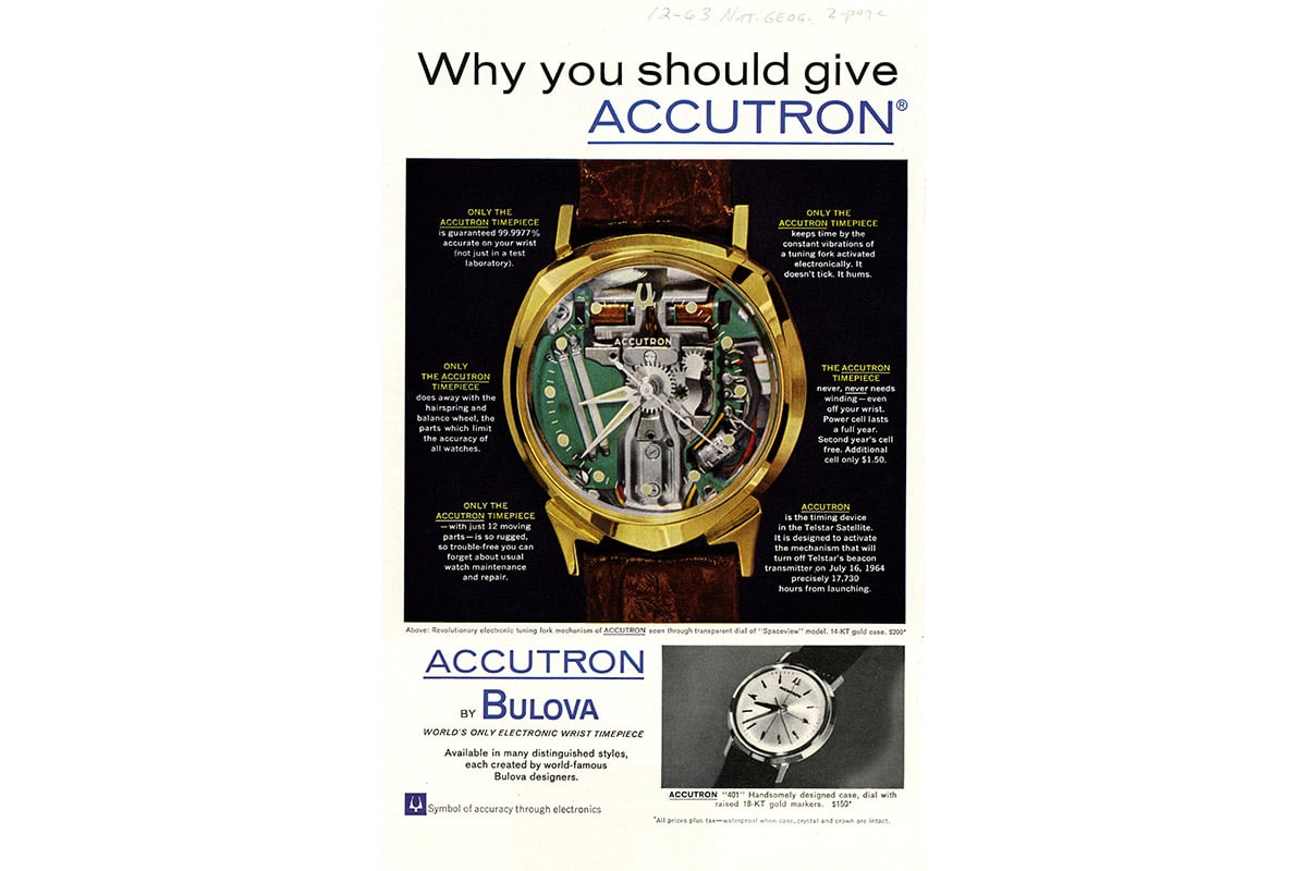 また時計メーカーでは初の国内ラジオコマーシャルを展開。世界初の時計ラジオ、世界初のテレビコマーシャルを放映するなど、マーケティングにも長けていた。そして、世界初の音叉(おんさ)式電子時計「アキュトロン」を発表し、月差±1分という高精度で時計の歴史に新たなページを加えた。