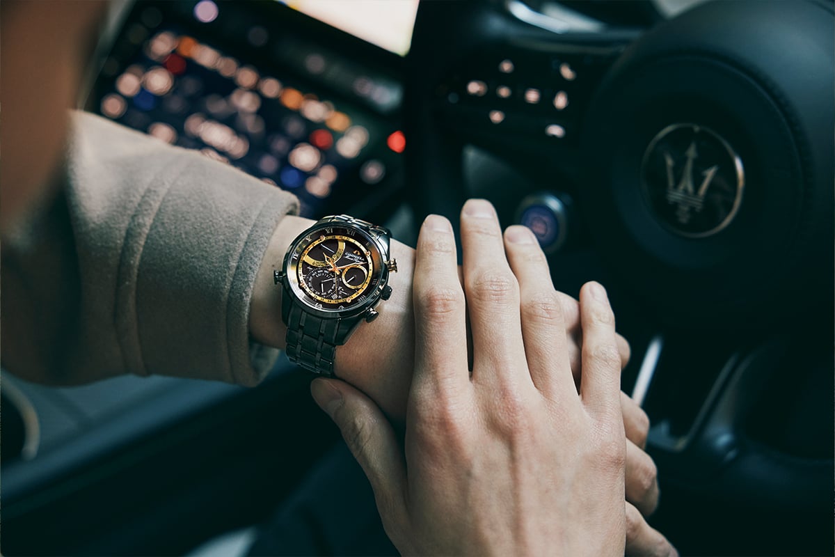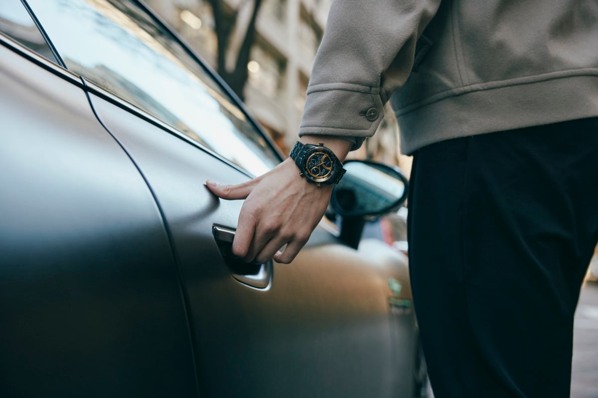 腕元にはカンパノラの「星響」が漆黒の艶めきを放ち、ステアリングホイールを握る左手の所作の中で、デュラテクトDLCとゴールドパーツのコントラストが朝の光を反射して美しい陰影を作る。