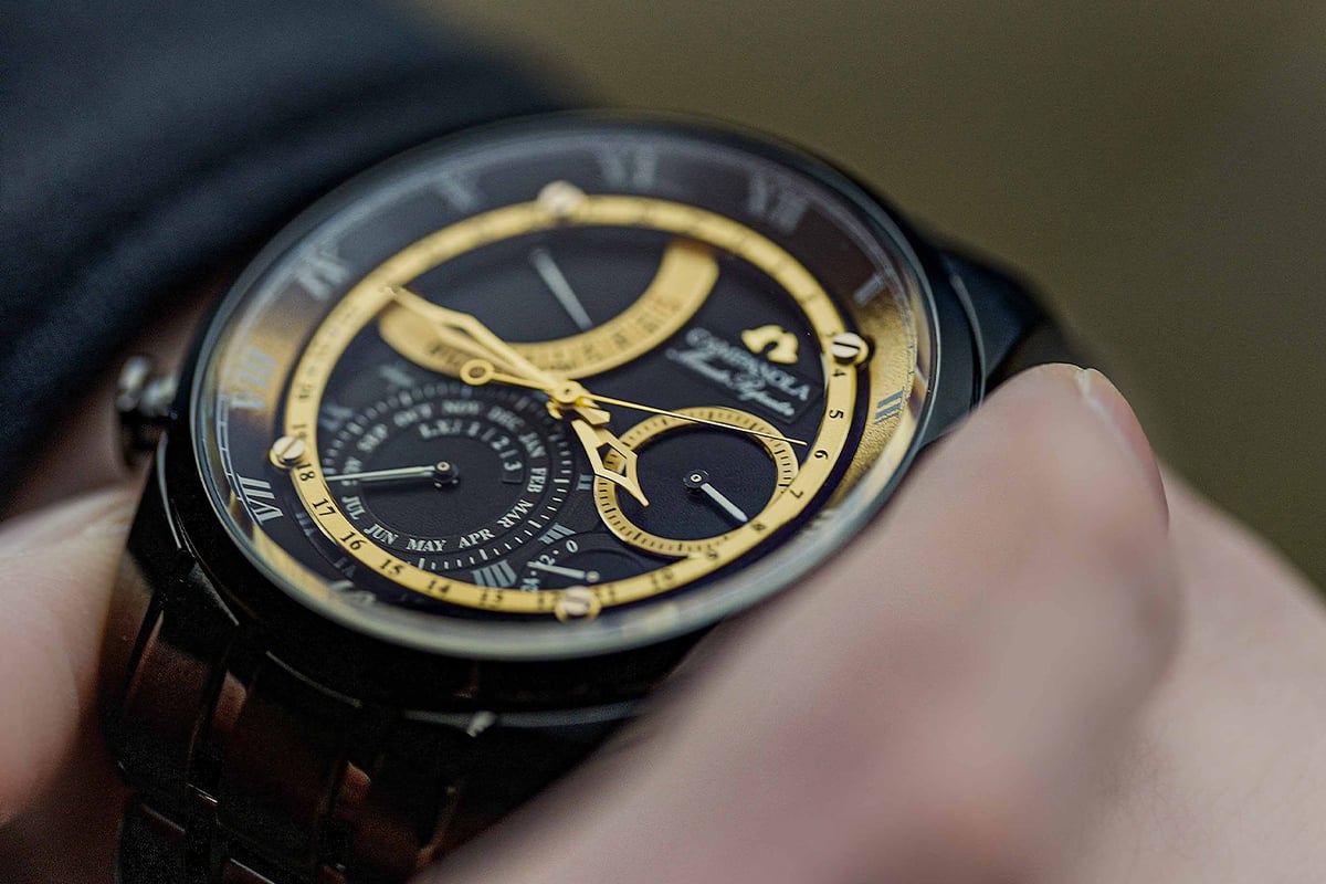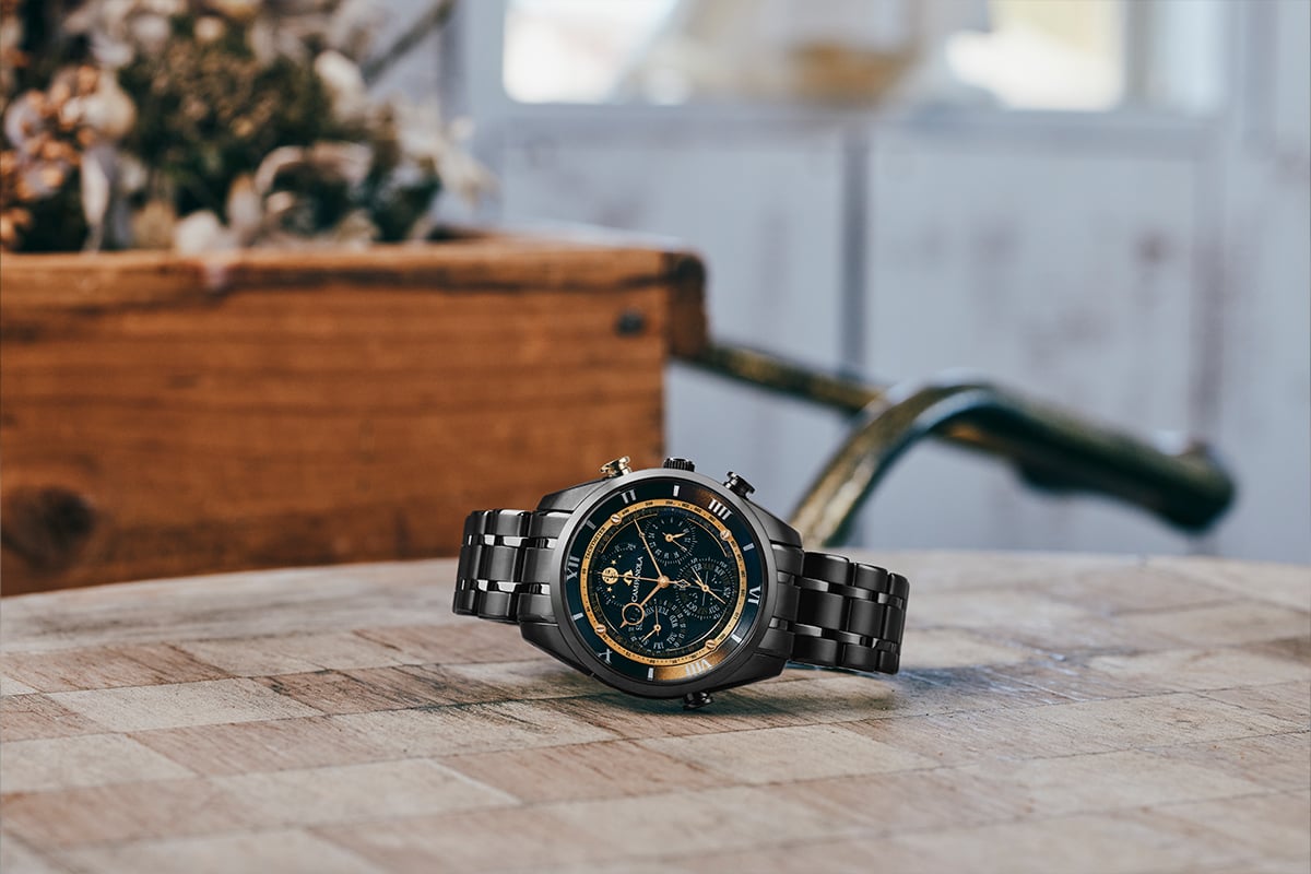 ケース全体を覆うデュラテクトDLCの深淵な黒と、随所に配されたゴールドのアクセントが絶妙なコントラストを生み出し、ひとつとして同じ表情を持たない芸術品へと昇華されている。手首の動きに合わせて微細に光を反射する文字板は、持ち主にだけ語りかける特別な小宇宙そのものである。