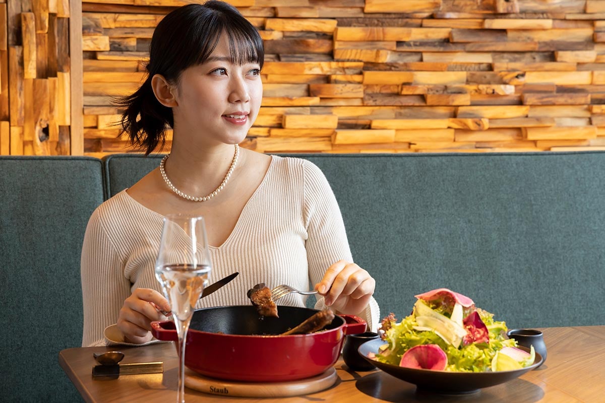 カリッとした表面に、とろけるような食感、そしてうま味が迸る。薪火で焼き上げたという信州豚はその味わいを最大限まで引き出すべく、骨がついたまま調理しているのだとか。もちろん、皿の上に肉と骨は切り分けられて出てくる。そんな気づかいにもうれしくなる。