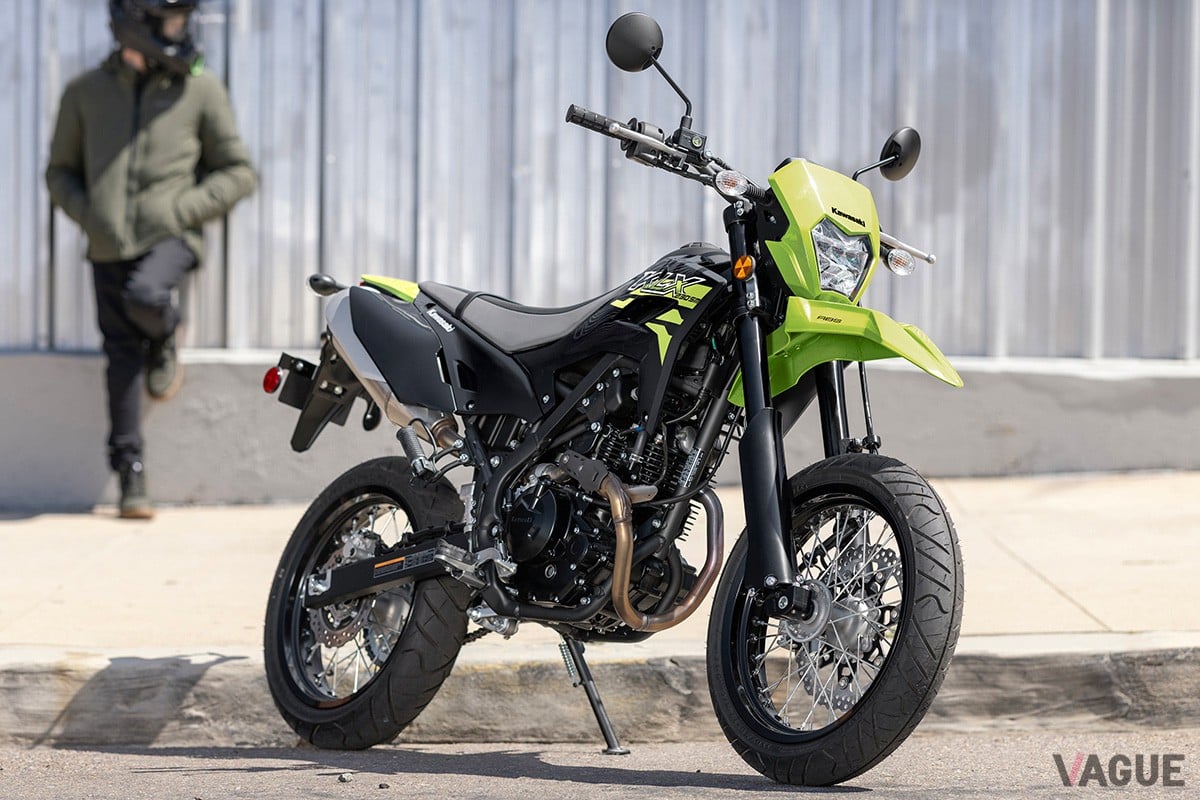 モトクロッサースタイルの車体にロードタイヤを装着したカワサキのスーパーモト「KLX230SM」がカラー&グラフィックを変更。エボニーとのツートーンカラーをまとった車体は、街中でも存在感抜群です。